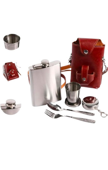 2642779 Набор 4 в 1: фляжка 9 oz, ложка, вилка, рюмка 100 мл, в чехле, коричневая кожа